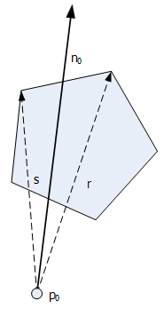 太easy了。假設多邊形是凸的,且射線端點p0不處于多邊形內,且射線單位方向矢量為n0。逐個取多邊形上的頂點,并且以其坐標構造自p0指向該頂點的矢量,如s、r。不難發現:s